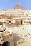 The plan of the pyramid complex here is clearer to see than at Khufu, and all those little drawings and maps I had been studying in books started to come to life. The three queens' pyramids lie to the south, and the remains of the mortuary temple to the east are more extensive than at the Great Pyramid. The king died around 26 years into his reign, before his pyramid was completed, and it's believed that the complex was hastily24 finished in mud25 brick, rather than limestone26, by his son Shepseskaf.